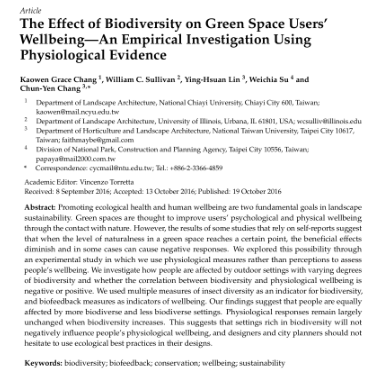 请参看研究论文:生物多样性对于绿色空间的使用者的益处——使用生理证据进行的调查研究