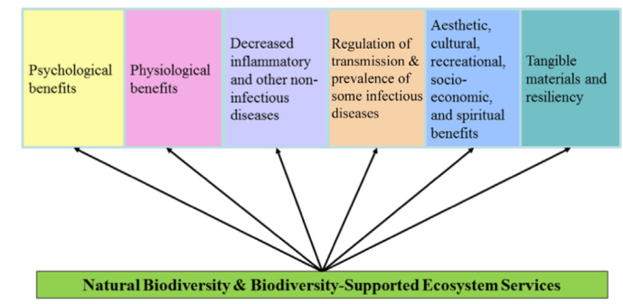 自然中的生物多样性和生物多样性支撑下的生态系统是可以触及,并具有弹性的。它对人的心理和生理都具有益处;它可以减少炎症和非传染病的流行;减少传染病的流行;带给人们美学、文化、娱乐、社会经济和精神上的益处。